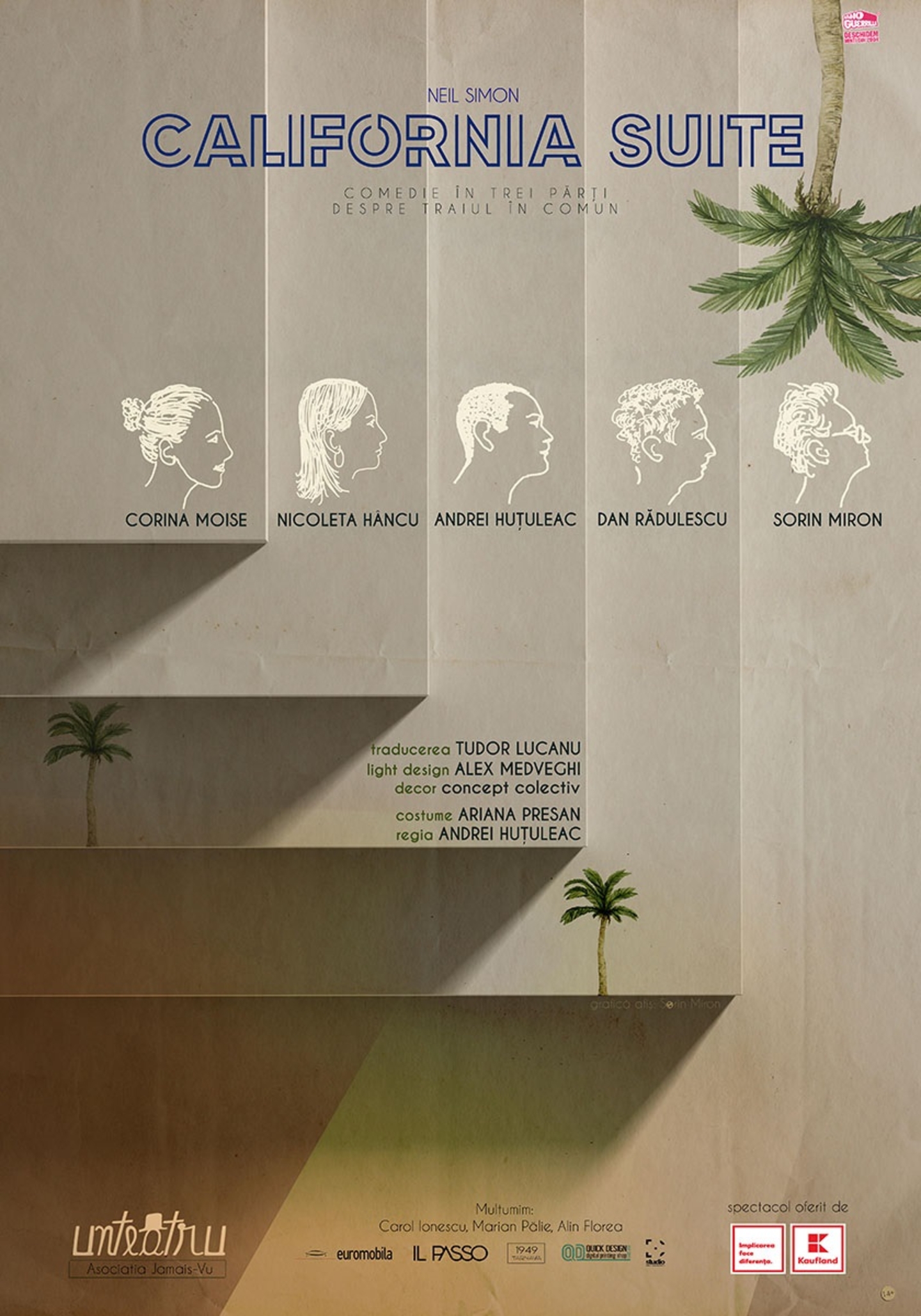 "California Suite is the first play I've directed. And while I would usually have a lot to say on the subject, the truth is that this time there is something more important inside this endeavor than the fact that it's a directorial debut. Namely: the desire to stay together, albeit temporarily, of actors who, for objective reasons (including the pandemic) hadn't been on stage for about a year. We all set out to make a show of our own, to regain our dignity and the joy of acting. In fact, the question the text asks is the same question we had to answer for ourselves as artists: «What makes us stick together even when all external circumstances point to us going on separate ways?» In the leading roles you will enjoy actors you have surely seen and appreciated on the stages of Bucharest: Corina Moise, Dan Rădulescu, Nicoleta Hâncu and Sorin Miron". Andrei Huțuleac, director