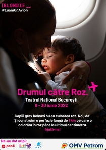 08 June 2022Starting from June 8, 2022, the "I.L. Caragiale" National Theatre will host in the Media Foyer (the wing facing Tudor Arghezi Street) a disturbing exhibition of photographs, whose title, The Road to Pink, speaks for itself... The exhibition is organized by the Blondie Association - Share for Another Share, an association that was founded so that all children, regardless of their material or social situation, always receive adequate and timely medical treatment. The exhibition aims to raise awareness and is also a fundraising. Photos of Blondie children - including children from Ukraine evacuated from the war and sick children transported to hospitals abroad - will be on display. "....we want to grow in number, to make a difference and show that if evil happens to come from the sky, we lift planes to bring good up there too" – that is the message of the Blondie Association. We spread the word! Starting from today, June 8, 2022, at 11 am and until June 30, 2022, at the National Theatre of Bucharest, Media Hall, we create (we say, we don't have evidence) the longest infusion ever seen. Yes, we are building a 1 km long infusion which, with your help, we'll be filling with pink liquid throughout the whole period! For every donation of at least €10, we will paint 1 meter of the infusion in pink. And so on until we fill it all up! We named the event The Road to Pink because that's how the lives of seriously ill children begin - with a long and very hard road. You'll see these children within the event, the children from the Blondie flights - Arya, Marki, Andra, Dominic. Paul and Ilinca. We'll be there every day to give you the pink syringe. The excitement is yours. The good, theirs! #drumulspreroz #1kmdeperfuzie Translated by Andreea Codrea-Boeriu