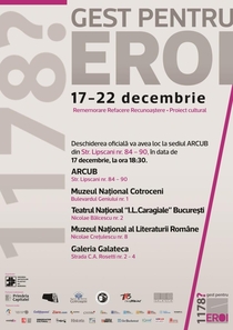 17 December 2019The project 1178? - Gesture for Heroes gathers artists in a symbolic process of remembrance, restoration and acknowledgement. Officially, 1178 people died at the Revolution, but the number is not yet final, many files are waiting for a verdict even now. Our gesture against oblivion, simple and discreet, reminds us of those who passed away in December 1989 and perhaps disappeared from the collective memory. The artistic gestures will be reunited in electronic format and presented in the form of projections held simultaneously between December 17th and 22nd, 2019 in five major cultural centres in Bucharest, at the headquarters of the host partners: ARCUB - Cultural Centre of Bucharest Municipality, Cotroceni National Museum, Museum National of Romanian Literature, “IL Caragiale” National Theatre of Bucharest and Galateca Gallery. The opening will take place on December 17th, 2019, from 6:30 pm, at the ARCUB headquarters in 84-90 Lipscani st. The project is a cultural and civic attitude, without political involvement. Partners: 21st December Association, ARCUB, Cotroceni National Museum, National Museum of Romanian Literature, the "I.L. Caragiale" National Theater of Bucharest, Galateca Gallery. Project launched by the Union of Visual Artists - Graphic Arts Branch and carried out with the support of the Capital City Hall through ARCUB and all partner institutions, with the pro bono involvement of the artists and the project team consisting of Anca Boeriu, Stefana Marmureanu and Alexandru Simion-Boeriu. Translated by Simona Nichiteanu
