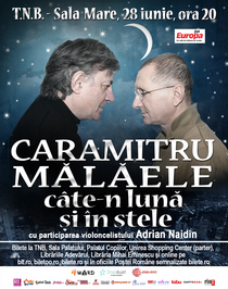 Spectacolul Caramitru - Mălăele, câte'n lună și în stele se va juca încă o dată, în ediție extraordinară, luni, 28 iunie, de la ora 20.00, pe Scena Mare a Teatrului Național din București. Deși spectacolul din data de 28 mai trebuia să fie ultimul din acest sezon, la cererea spectatorilor care nu au reușit să își cumpere bilet pentru ediția finală, cei doi actori și-au amânat plecarea în concediu pentru a susține încă un spectacol la final de stagiune. Înfruntarea va avea forță, se râde cu lacrimi în reprize vulcanice de haz spumos, iar hohotele vor deveni emoții, în momente cu o încărcătură sensibilă profundă. La marea finală, orice lovitură de teatru este permisă. De la Shakespeare la Topârceanu, de la Nichita, la Marin Sorescu, Ion Caramitru îi răspunde cu inteligență și subtilitate unui partener vulcanic, irezistibil în rolurile comice, impresionant în cele dramatice - Horațiu Mălăele. Seducători, cu un umor irezistibil și cu profunzimea care i-a făcut legende, cei doi se vor înfrunta în versuri, un duel plin de forță și energie, moderat de incredibilă muzică a violoncelistului Adrian Naidin. Adrian Naidin și-a sedus întotdeauna publicul cu o combinație de stiluri muzicale, pe un violoncel care atinge note de-o frumusețe și perfecțiune rare.