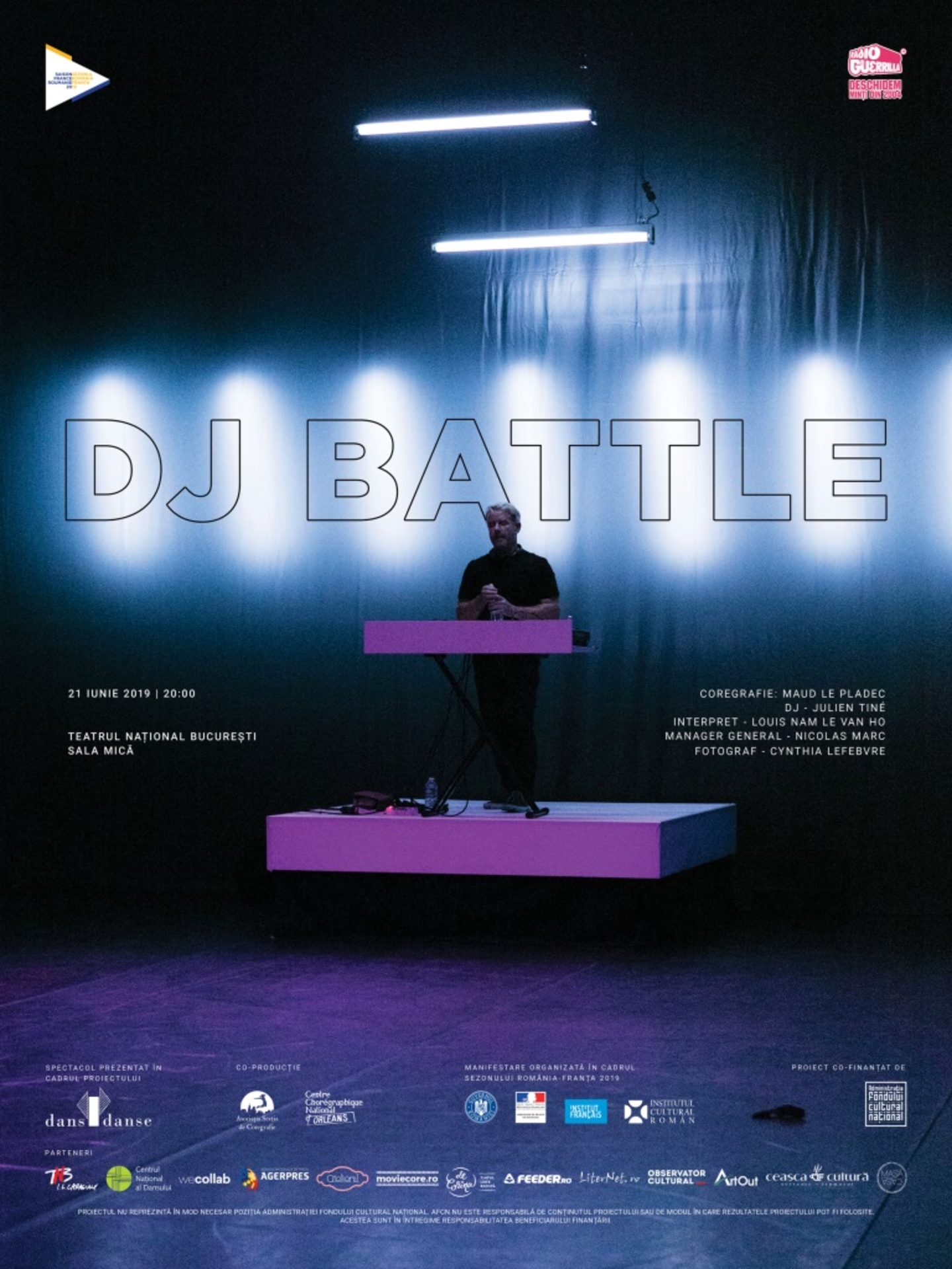 "DJ Battle" este un spectacol-dialog între un DJ și un dansator care au în comun un element cheie: muzica. Coregrafa Maud Le Pladec aduce pe scenă un experiment în care muzica nu mai este cea care conduce dansatorul, ci ambele arte sunt la egalitate și se mulează una după cealaltă. Spectatorii vor avea ocazia să își dea frâu liber mișcărilor intrând în dialogul creat de artiștii francezi.