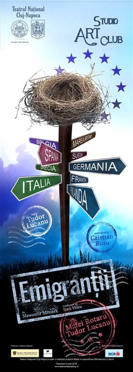 În Emigranții, Mrożek prelucrează experiența marginalizantă a propriului exil, a refugiatului din varii motive, constituindu-se într-un studiu al condiției exilatului. Colegii de apartament AA și XX discută între ei, dialogul lor luând treptat forma unui duel în care ei se demască reciproc.