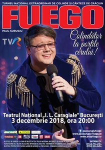 03 Decembrie 2018Eveniment privat găzduit de Teatrul Național din București. Răspunderea pentru calitatea și conținutul acestui eveniment aparține exclusiv organizatorului! Luna decembrie va fi luna în care Paul Surugiu - Fuego, un brand al Crăciunului românesc, un adevărat fenomen, Artist al Poporului Republicii Moldova și unul dintre cei mai iubiți artiști români va porni la drum cu un tur de forțe, un turneu eveniment dedicat sărbătorilor de iarnă, spiritului românesc și valorilor autentice - Colindător la porţile cerului! Turneul va debuta pe 3 și se va încheia pe 29 decembrie 2018, poposind în mai toată România, dar și în Republica Moldova. Fuego propune publicului său multă emoție, o sărbătoare a muzicii de suflet, cu noutăți, premiere, dar și cu tradiționalele sale piese de iarnă. Astfel că ne vom bucura împreună, într-un show de sunet și lumini, de tot ce are mai frumos iarna, de sentimentele legate de părinți și de oamenii dragi, de reîntâlniri și emoții ale copilăriei, de credință și desigur, de minunatul sentiment de patriotism, cel pe care mulți l-au uitat din păcate. Alături de band-ul său și de câteva surprize unice, Fuego va oferi un spectacol de poveste, două ore de trăiri intense, de fericiri, în care nimic nu va mai conta cu excepția muzicii și a emoțiilor puternice!