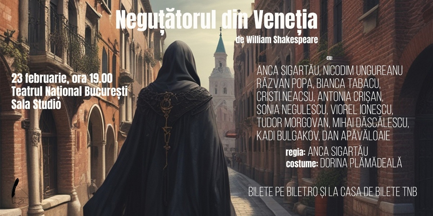 Este povestea cămătarului evreu Shylock, este povestea negustorului Antonio care își pune viața gaj, este povestea Porției și a lui Bassanio și a iubirii lor. Este povestea Neguțătorului din Veneția, pe care, respectând fidel textul shakespearian, regizoarea Anca Sigartău o regândește creativ, propunând publicului spectator o cheie de interpretare unică, care cu siguranță vă va surprinde plăcut.