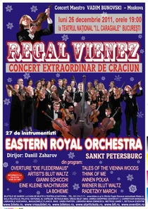 Sărbătorind 10 ani de tradiţie pentru români, spectacolul Regal Vienez, cu care Gec Artistic ne cadoriseşte în fiecare decembrie, va delecta publicul şi anul acesta cu o experienţă unică în România: Regal Vienez. Cu siguranţă sfârşitul anului 2011 va fi unul deosebit pentru cei ce apreciază cu adevărat asemenea evenimente, căci de această dată Viena ne inspiră una dintre cele mai mari tradiţii internaţionale prin intermediul orchestrei Eastern Royal Orchestra, din Sankt Petersburg condusă de dirijorul, Daniil Zaharov şi concert maestro: Vadim Bunovski din Moskova ce va susţine un turneu extins în marile oraşe europene la finalul acestui an. Din cadrul orchestrei, face parte şi binecunoscutul acordeonist de excepţie Evgheni Nagruzza, ce beneficiază de drepturile de autor acordate personal de Richard Galiano (acordeonistul numărul 1 al lumii). Vom asculta Strauss şi anul acesta şi ne vom lăsa purtaţi pe valurile Dunării Albastre, fiind alături de orchestră faimoasa soprană Marina Raddis - Prim solistă a Operei Naţionale din Chişinău. Nu vorbim despre un simplu balet clasic, ci despre adevărate opere de artă, generate de dansuri contemporane, celebrele valsuri vieneze, menite să aducă un plus important de valoare operelor din secolele precedente. Ritmurile vieneze ale dinastiei Strauss vin să ne mângâie trăsăturile subtile ale sufletului printr-un concert intitulat Regal Vienez. Iar după cum bine ştim această noapte mirifică şi cea mai lungă este la Sankt Petesburg castelul de iarnă al ţarilor ruşi şi, de ce nu, al sufletelor dumneavoastră, de aceea organizatorii acestui turneu din peste 20 de localităţi din România vor topi sufletele de gheaţă ale acestor vremuri cu ritmuri muzicale de-o frenezie şi o bună dispoziţie, dându-i mână liberă dirijorului Daniil Zaharov de a dirija o orchestră internaţională compusă din 27 de instrumentişti de primă clasă. Vă mulţumim pentru alegerea făcută şi vă dorim Crăciun fericit! Pentru că orice cadou e o surpriză, programul acestei seri va fi un mister ..!!!