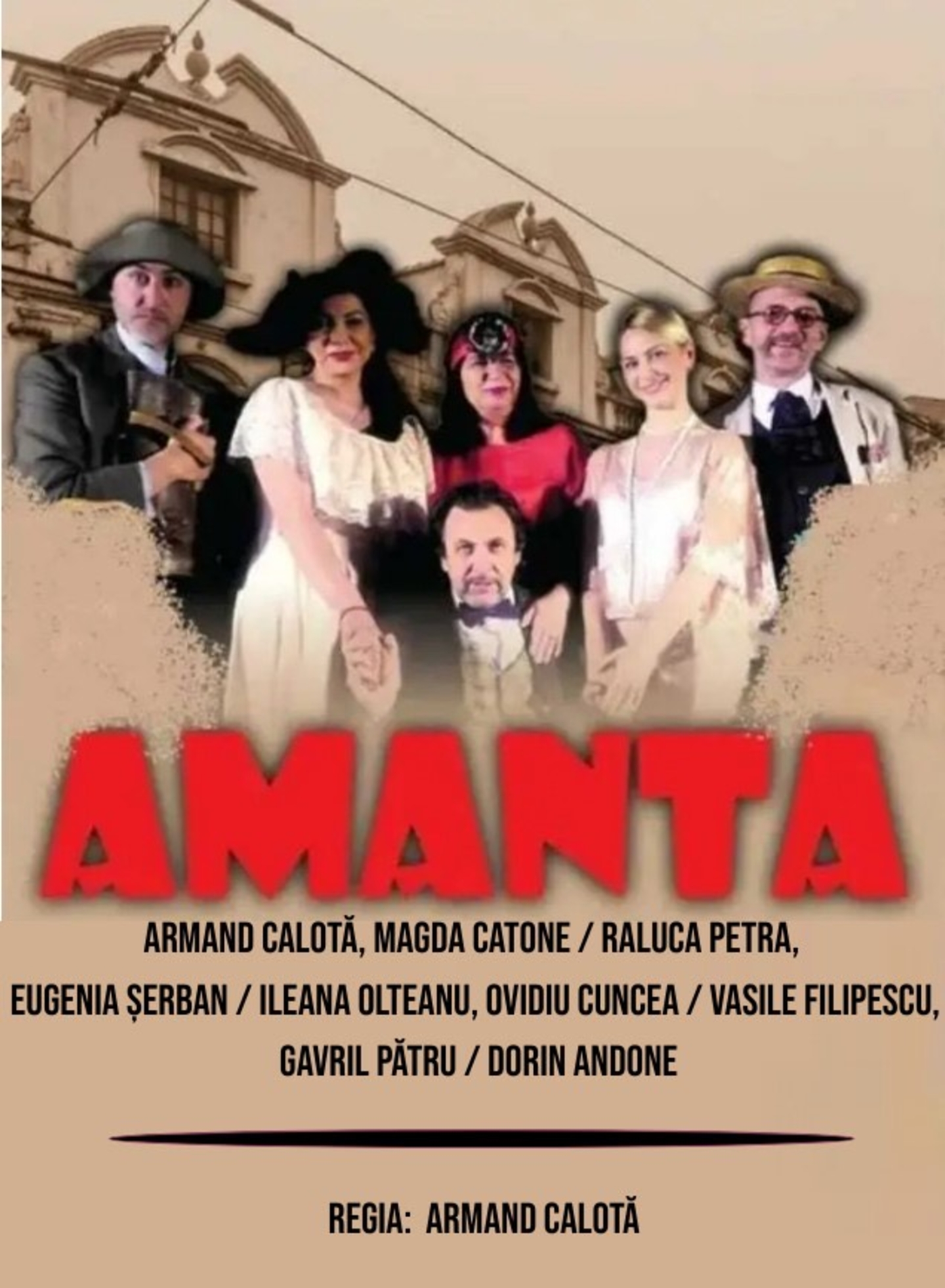 Comedia "Amanta" în regia lui Armand Calinovici (Armand Calotă), va fi pusă în scenă de artiști de notorietate, iubiți de public pentru rolurile de excepție interpretate pe marile scene de teatru din România: Armand Calotă (Emil Strâmbuleanu), Magda Catone / Raluca Petra (Didina Strâmbuleanu), Eugenia Șerban / Ileana Olteanu (Olga), Vasile Filipescu / Ovidiu Cuncea (Traian Bungrăzescu), Gavril Pătru / Dorin And one / Edi Cîrlan (Matei Pintenaru).