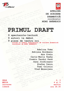 04 Martie 2023Lansat în mai 2022, în cadrul Centrului de Cercetare și Creație Teatrală „Ion Sava”, Atelierul de Scriere Dramatică, coordonat de dramaturgul și scenaristul Mimi Brănescu se va încheia cu o serie de spectacole – lectură, sub titlul Primul Draft. Vor fi prezentate 9 piese de teatru rezultate în urma atelierului. Cei care semnează aceste texte sunt: Adelina Toma, Adriana Bordeanu, Ana Crețu, Carla-Maria Teaha, Cosmin Teodor Pană, Oana Jindiceanu, Ștefan Iancu, Tomi Cristin, Vlad Moszojanu. Spectacolele - lectură vor avea loc în zilele de 2, 3, 4 și 5 martie 2023, ora 18:30, la Sala Media a TNB. Intrarea este liberă.